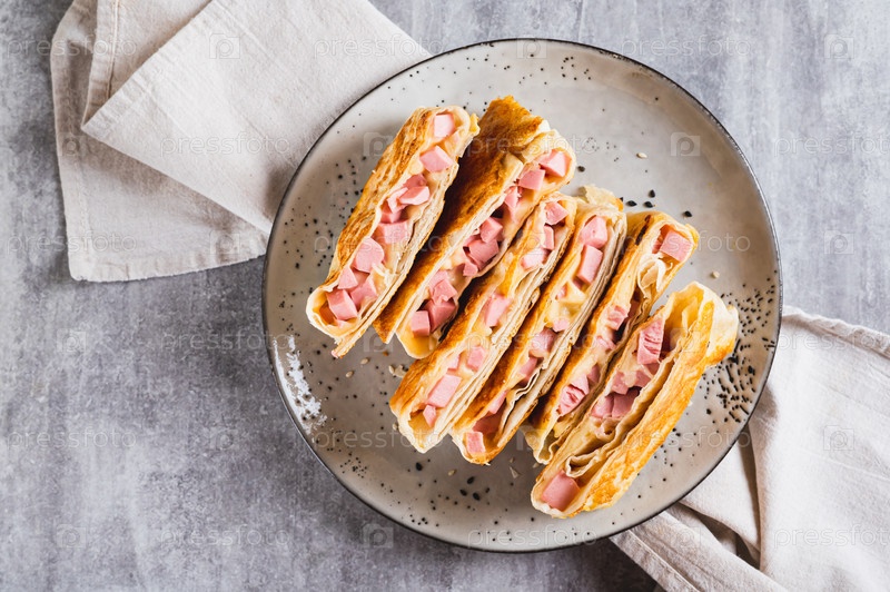 Закрыть жареные бутерброды в пита хлеб с колбасой и сыром на тарелке вид сверху