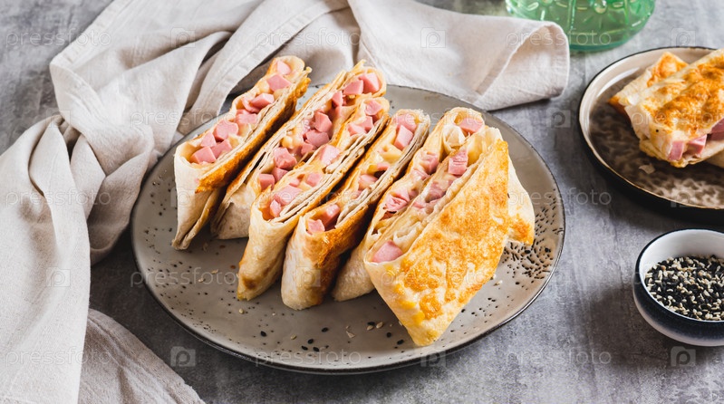 Сваренные на гриле бутерброды в пита хлеб с колбасой и сыром на тарелке веб-баннер