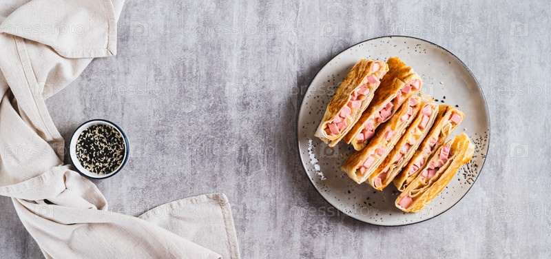 Хрустящие конверты с колбасой и сыром в плоском хлебе на тарелке с видом на веб-баннер