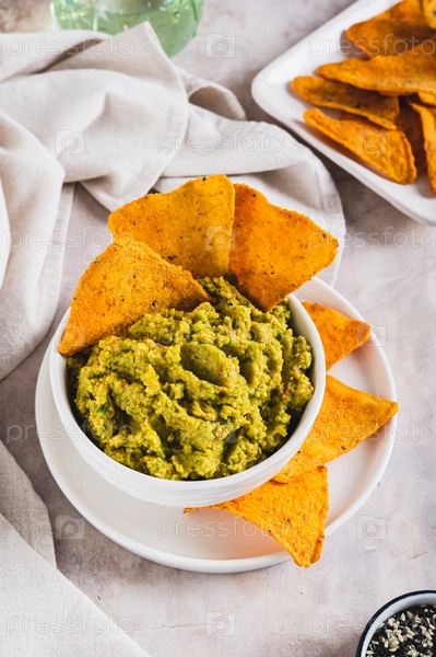 Вкусная гуакамоле в миске и чипсы тортильи на тарелке на столе вертикальный вид