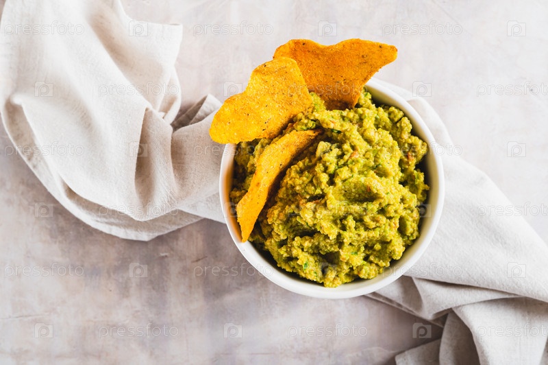 Закрыть чашу гуакамоле и мексиканские чипсы начос на тарелке на вид сверху стола