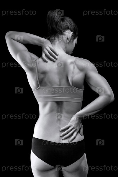 Бодибилдер женщина страдает от боли в спине и шее после тренировки, черный фон