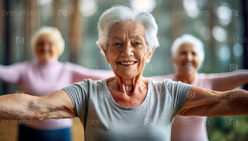 Пожилая женщина улыбается во время занятий йогой или растяжкой в окружении других старших участников