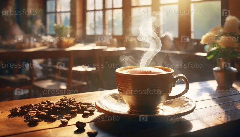 Парящая чашка свежего кофе в теплом уютном интерьере кафе с естественным солнечным светом и разбросанными кофейными зернами на деревянном столе
