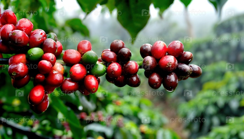 Закрытие кофейной вишни на ветке свежей и созревшей для сбора урожая
