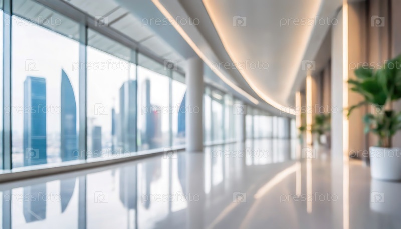 Современный, яркий корпоративный лобби с окнами от пола до потолка, предлагающий вид на городской горизонт, с полированными полами и зеленью для гостеприимной эстетики