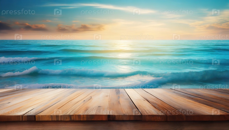Океанские волны катятся к деревянной палубе во время заката с драматическим небом и мирной атмосферой, создавая безмятежный вид на море