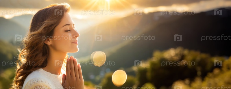 Женщина молится в освещенном солнцем природном ландшафте с закрытыми глазами, отражая мир и духовность