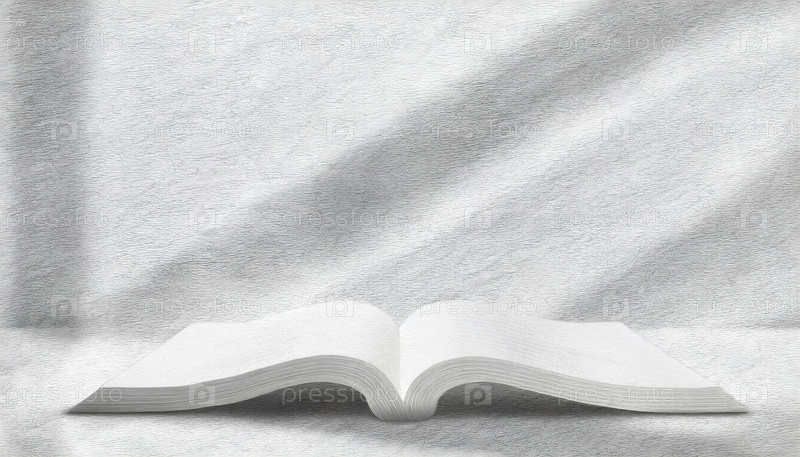 Минималистическая белая открытая книга, лежащая на текстурированной поверхности с мягкой теневой игрой в естественном свете