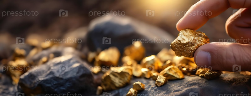 Рука выбирает золотой самородок среди камней на закате. Панорама с пространством для копирования
