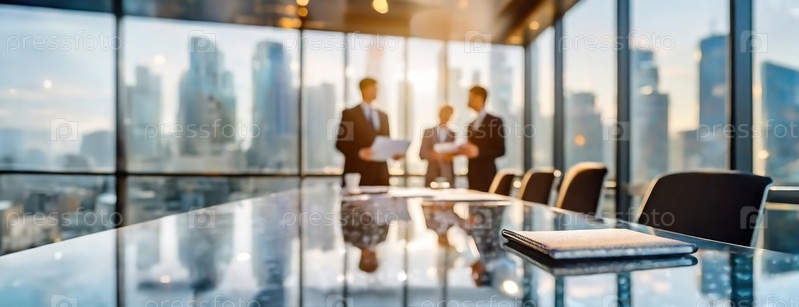 Исполнительный совет с большими стеклянными окнами, демонстрирующий городской горизонт на заднем плане, когда люди в костюмах участвуют в дискуссиях вокруг стола