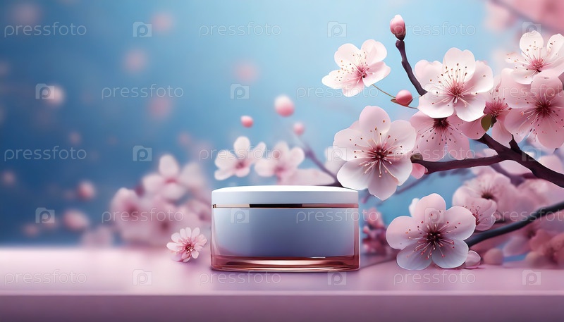 Роскошная сливочная банка, окруженная цветущими цветами вишни в мягкой пастельной сцене
