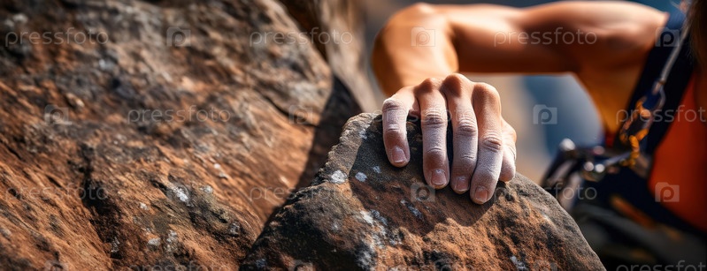 Рука альпиниста захватывает скалистую поверхность, поднимаясь по крутому обрыву