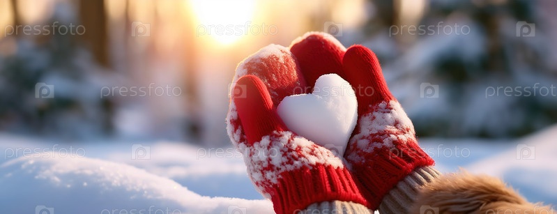 Руки в красных перчатках, держащие снежную фигуру в форме сердца во время зимнего восхода солнца в снежном лесу