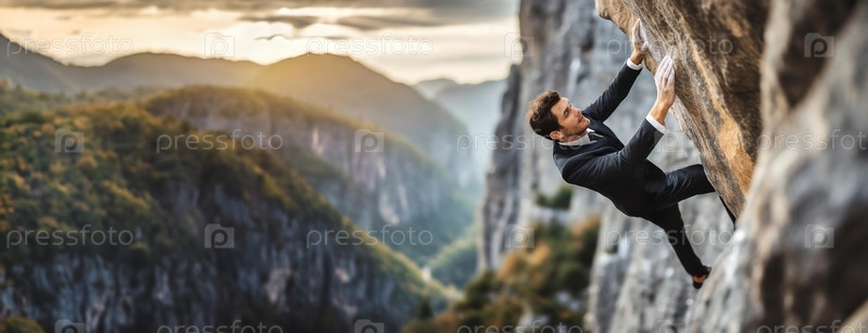Бизнесмен в костюме поднимается по крутой скале, символизирующей задачу преодоления препятствий в живописной горной обстановке