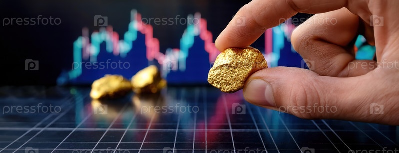 Рука, держащая золотой самородок перед финансовым графиком, символизирует стоимость золота на инвестиционных рынках