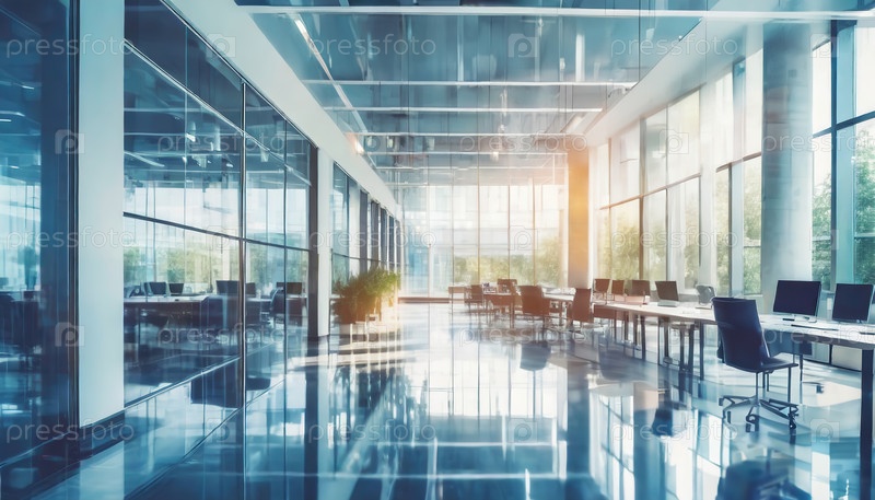 Просторный и современный офисный интерьер с большими окнами, естественным светом, открытыми столами и стеклянными стенами с ярким и профессиональным видом