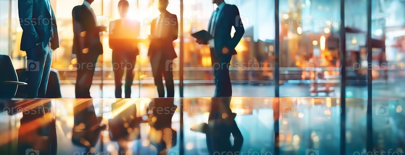 Бизнес-профессионалы стоят в современном офисе с городскими огнями на заднем плане
