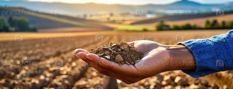 Рука, держащая сухую почву в высохшей сельскохозяйственной среде с размытыми холмами на заднем плане на закате