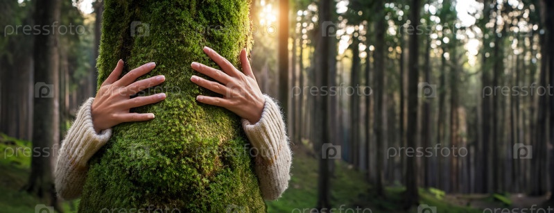 Человек обнимает покрытое мхом дерево в густом лесу с фильтрующим солнечный свет. Международный день лесов