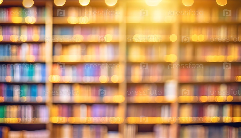 Книжная полка, наполненная красочными книгами, размытыми теплыми бокеховыми огнями, создающими уютную атмосферу для фона