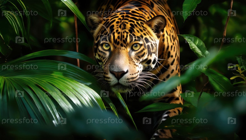 Ягуар скрывается в пышных зеленых джунглях листва с пронзительными желтыми глазами и поразительным узором пятен