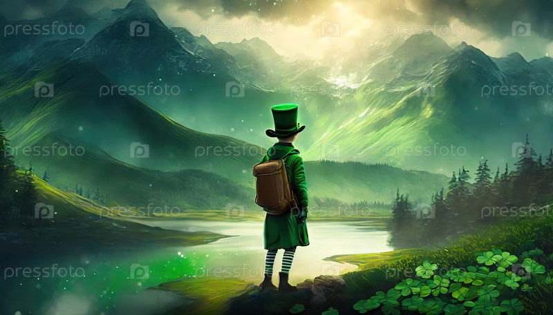 Яркий лепрекон с зеленой шляпой и рюкзаком, стоящий у реки, окруженной пышными ирландскими горами и клеверами. День Святого Патрика