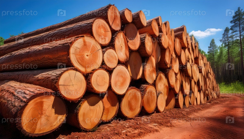 Свежесрезанные бревна аккуратно сложены в лесу с ясным небом и солнечным светом, освещающим древесные зерна