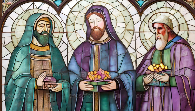 Витражи с изображением трех мудрецов, предлагающих подарки. Три короля День Богоявления фон