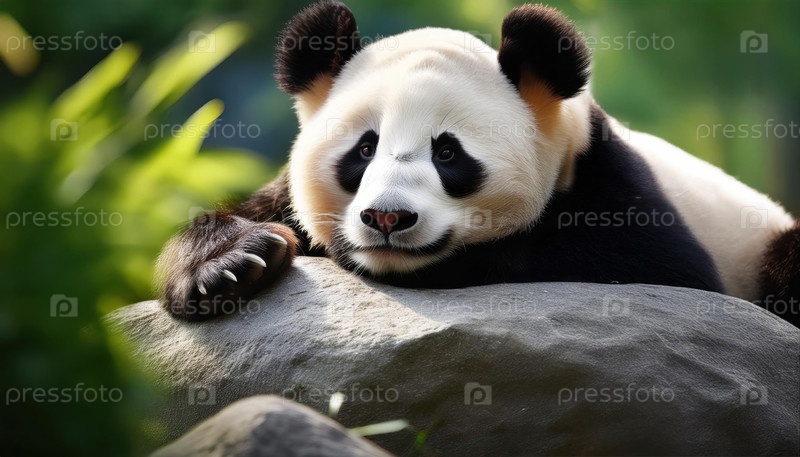Панда отдыхает на скале в естественной среде, демонстрируя свое очарование и расслабленное поведение