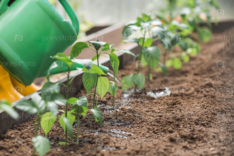 Пожилая женщина с поливом может поливать землю перед посадкой растения. Семена высаживают в землю в теплице. Концепция весенней посадки овощей и сельского хозяйства
