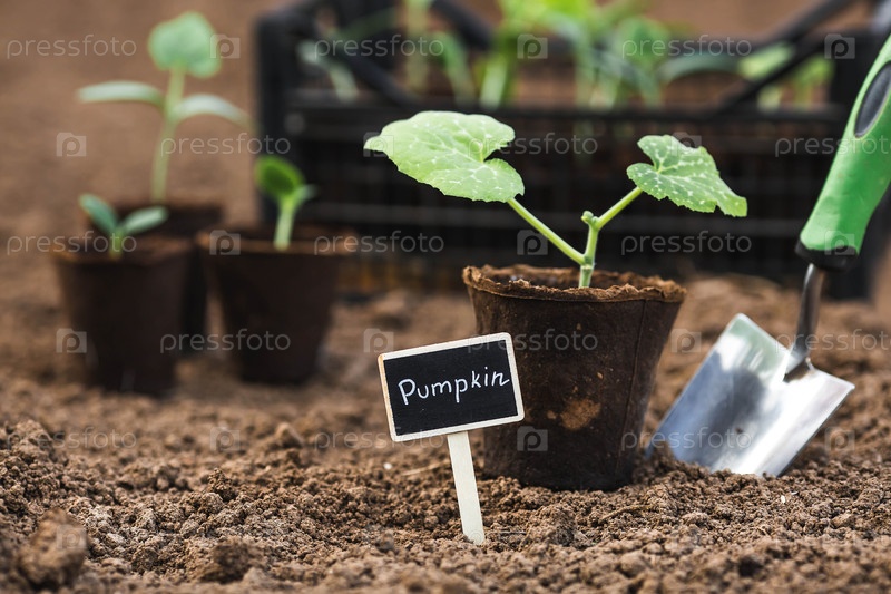 Плечевое лезвие и тыквенные саженцы высаживают в землю. Концепция весенней посадки овощей и земледелия. Знак с надписью тыква