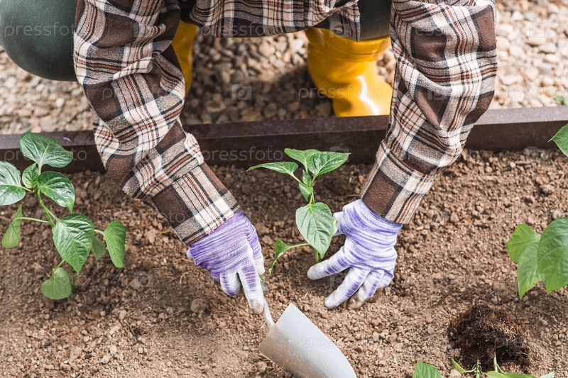 Пожилая женщина в садовых перчатках сажает молодое растение в землю. Семена колокольного перца высаживают в землю. Концепция весенней посадки овощей и сельского хозяйства