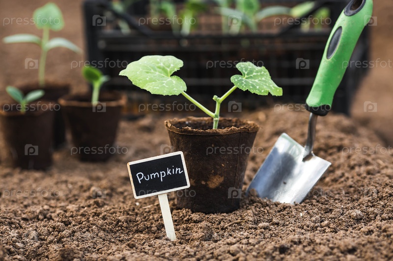 Плечевое лезвие и тыквенные саженцы высаживают в землю. Концепция весенней посадки овощей и земледелия. Знак с надписью тыква