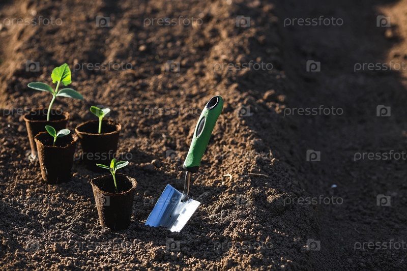 Спатула и овощные саженцы в торфяных горшках высаживаются в грунт. Концепция весенней посадки овощей и земледелия
