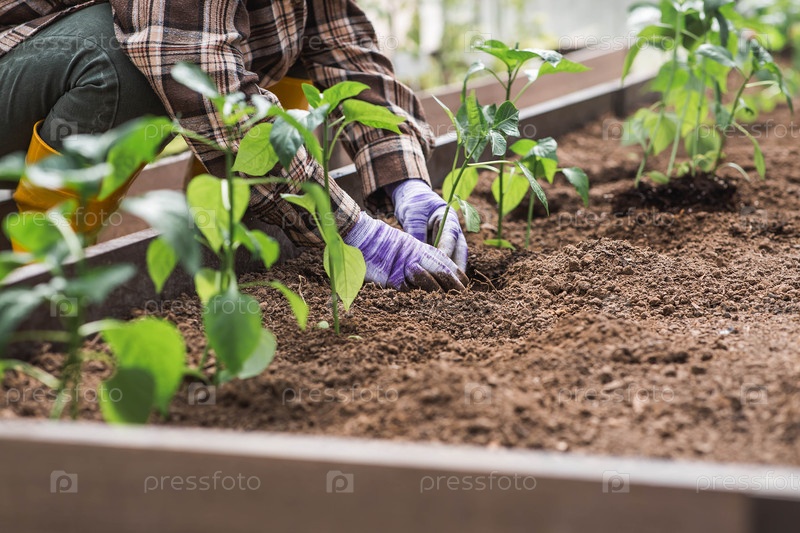 Пожилая женщина в садовых перчатках сажает молодое растение в землю. Семена колокольного перца высаживают в землю. Концепция весенней посадки овощей и сельского хозяйства