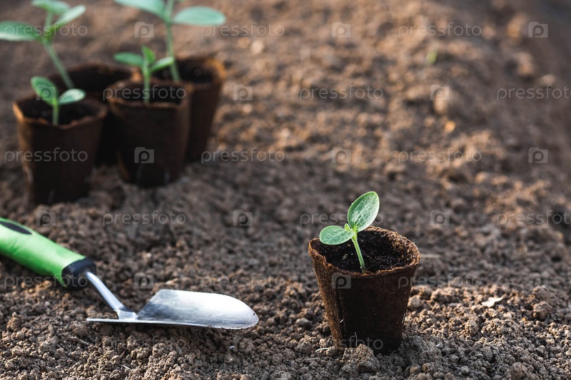 Спатула и овощные саженцы в торфяных горшках высаживаются в грунт. Концепция весенней посадки овощей и земледелия