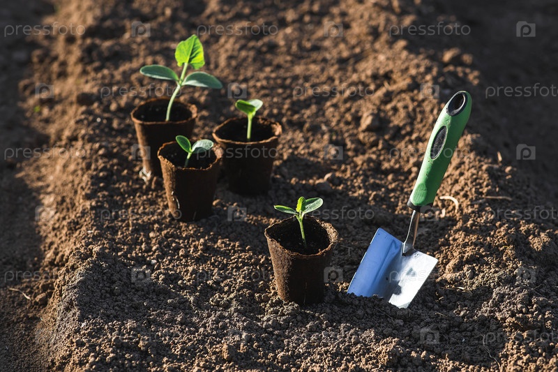 Спатула и овощные саженцы в торфяных горшках высаживаются в грунт. Концепция весенней посадки овощей и земледелия