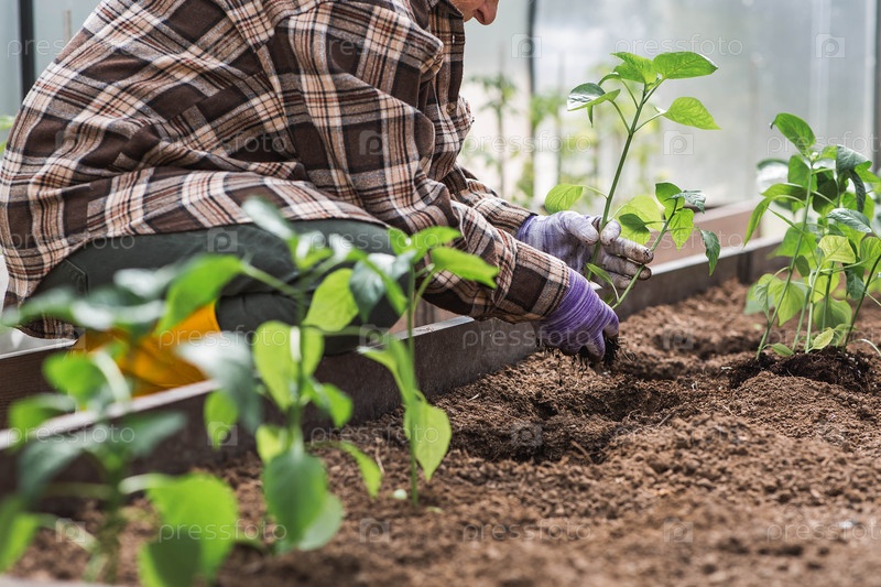Пожилая женщина в садовых перчатках сажает молодое растение в землю. Семена колокольного перца высаживают в землю. Концепция весенней посадки овощей и сельского хозяйства