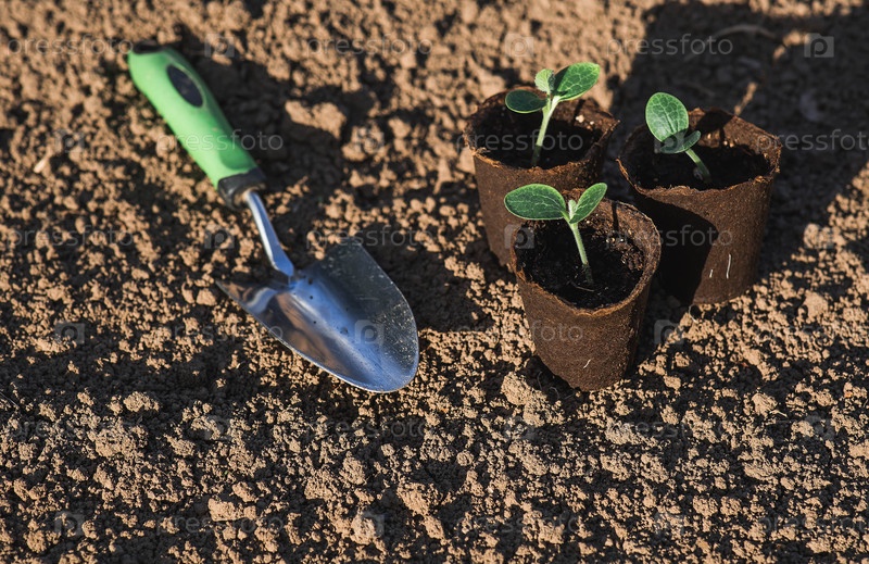 Спатула и овощные саженцы в торфяных горшках высаживаются в грунт. Концепция весенней посадки овощей и земледелия