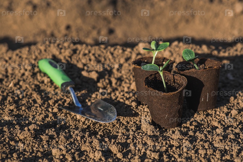 Спатула и овощные саженцы в торфяных горшках высаживаются в грунт. Концепция весенней посадки овощей и земледелия