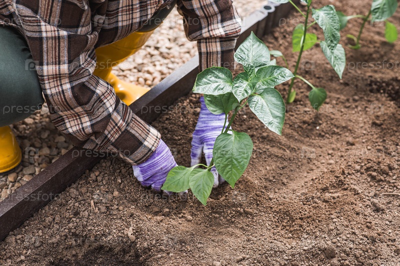 Пожилая женщина в садовых перчатках сажает молодое растение в землю. Семена колокольного перца высаживают в землю. Концепция весенней посадки овощей и сельского хозяйства