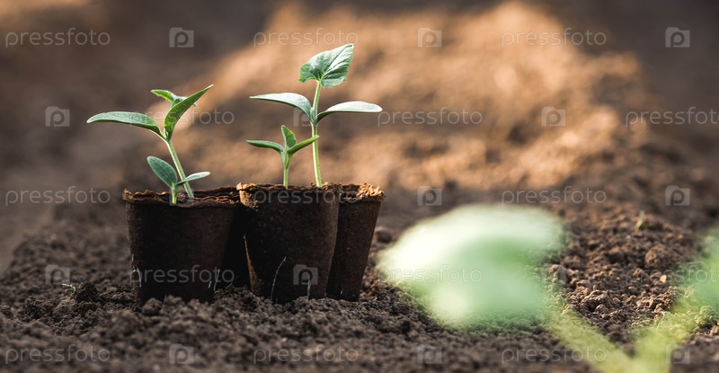 Спатула и овощные саженцы в торфяных горшках высаживаются в грунт. Концепция весенней посадки овощей и земледелия