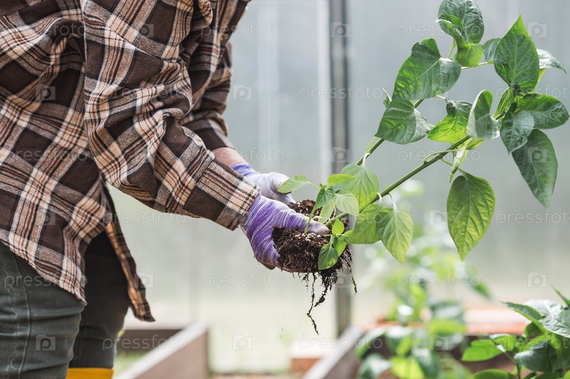 Пожилая женщина в садовых перчатках сажает молодое растение в землю. Семена колокольного перца высаживают в землю. Концепция весенней посадки овощей и сельского хозяйства