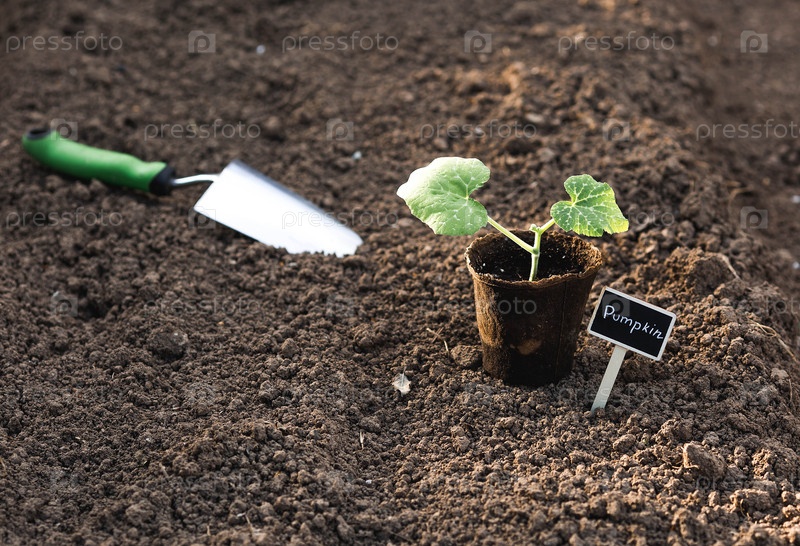 Плечевое лезвие и тыквенные саженцы высаживают в землю. Концепция весенней посадки овощей и земледелия. Знак с надписью тыква