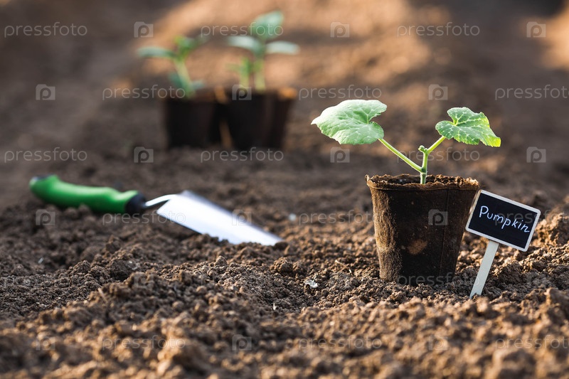 Плечевое лезвие и тыквенные саженцы высаживают в землю. Концепция весенней посадки овощей и земледелия. Знак с надписью тыква