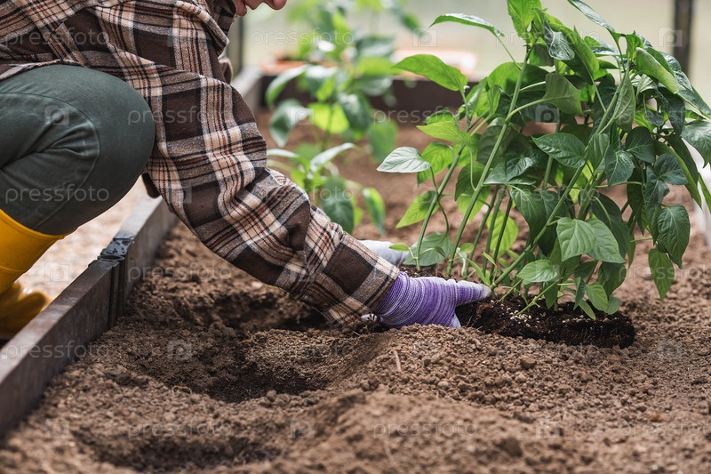 Пожилая женщина в садовых перчатках сажает молодое растение в землю. Семена колокольного перца высаживают в землю. Концепция весенней посадки овощей и сельского хозяйства