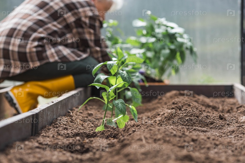 Пожилая женщина в садовых перчатках сажает молодое растение в землю. Семена колокольного перца высаживают в землю. Концепция весенней посадки овощей и сельского хозяйства