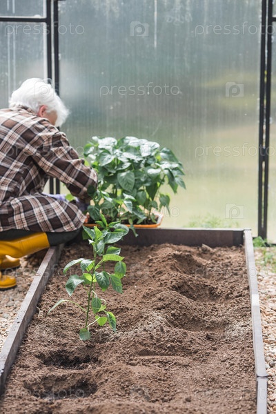 Пожилая женщина в садовых перчатках сажает молодое растение в землю. Семена колокольного перца высаживают в землю. Концепция весенней посадки овощей и сельского хозяйства