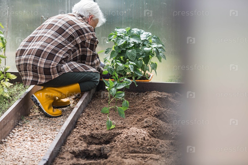 Пожилая женщина в садовых перчатках сажает молодое растение в землю. Семена колокольного перца высаживают в землю. Концепция весенней посадки овощей и сельского хозяйства